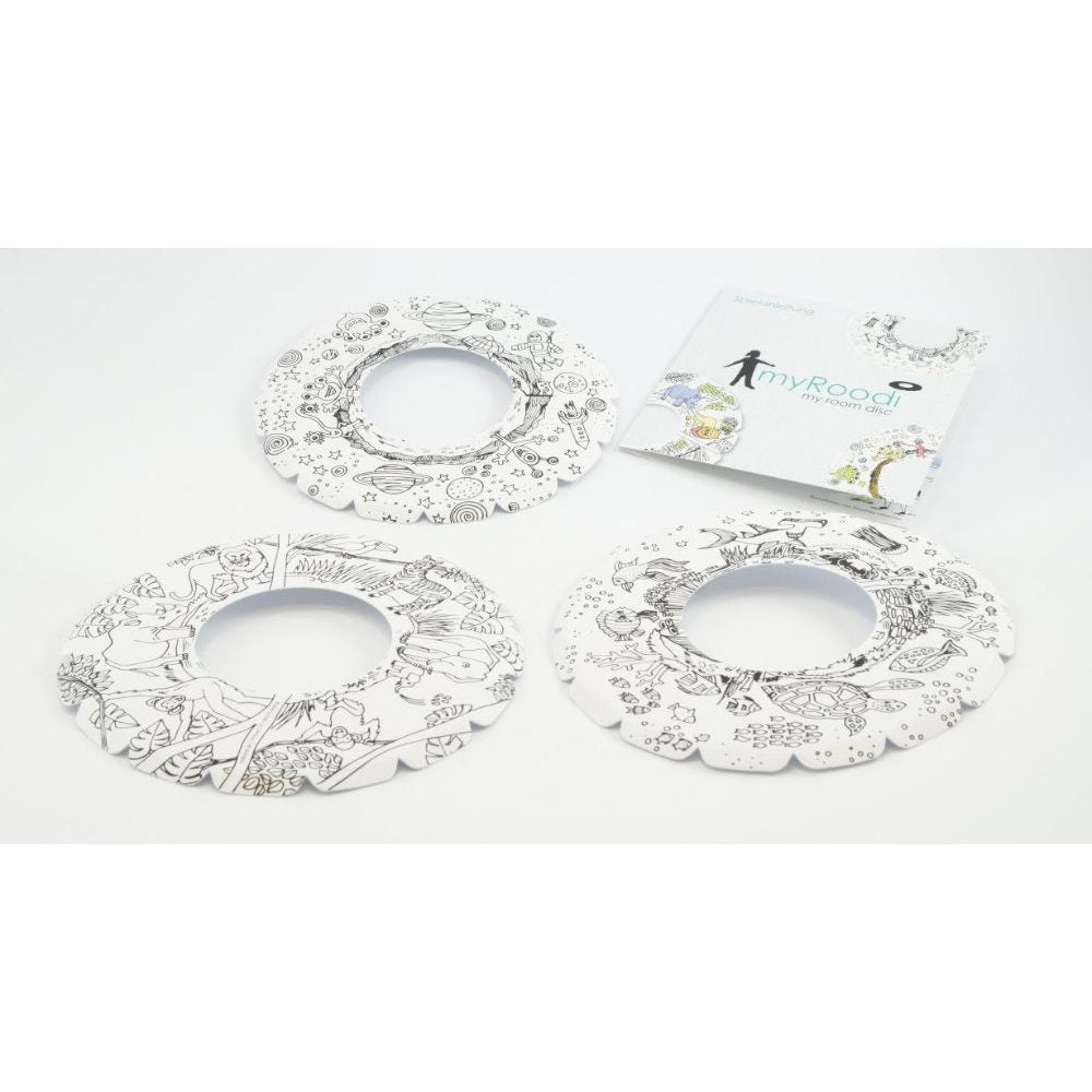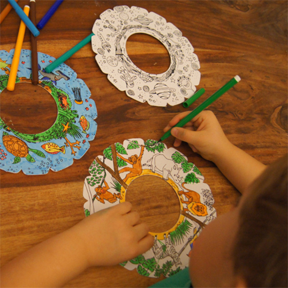 3 Indoor-Wurscheiben aus stabilem Premiumkarton mit schicken Motiven, wie Unterwasser, Safari und Weltraum zum Ausmalen.